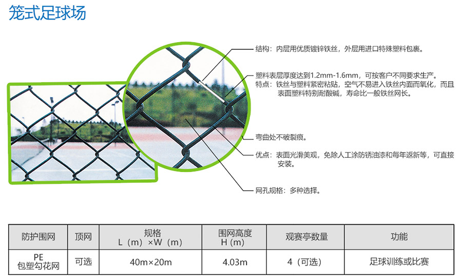 集教学、训练、娱乐健身、比赛等功能于一身,笼式足球场占地面积小、运动安全性高、对周边环境影响小,相较于传统足球场更适宜推广。尤其是可根据场地需求定制等缩型球场的特点,使得笼式足球场可以在所有的公共场所推广、建造。