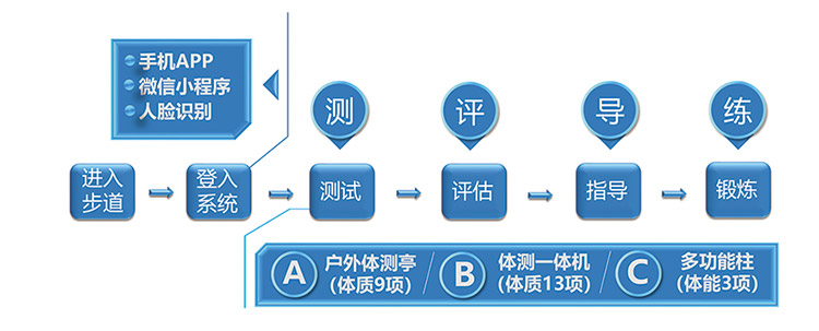 在现有步道/跑道的基础上,增加采集用户体质、体能、运动数据的高度集成智能化设备,通过云计算、移动互联网、大数据、人脸识别、无感采集等科技手段使之互联互通,用户通过这套系统可以达到智能科学健身的目的,并为用户搭建电子健康档案的解决方案。